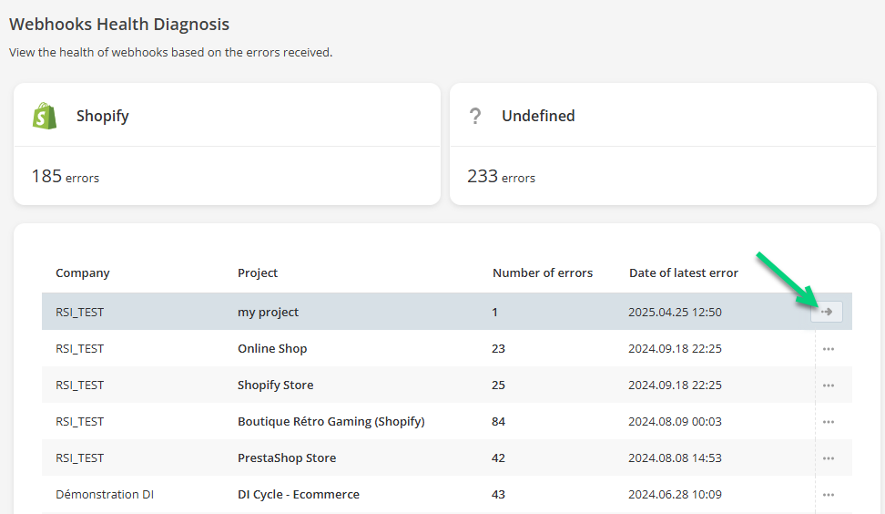 In the upper part of the page, there are the error numbers per integration for the account (in this case, we only have Shopify, but you could have PrestaShop and Adobe Commerce).